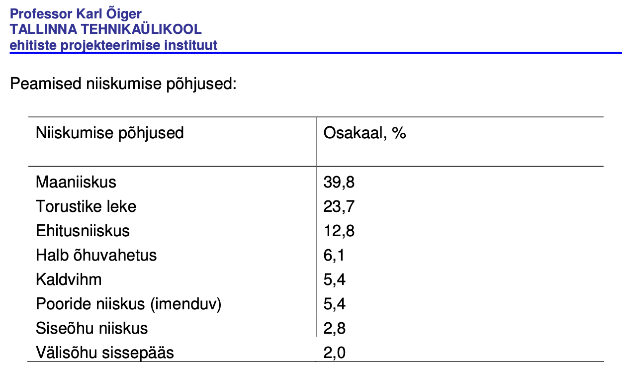 Seenkahjustuste kujunemiseks on hoones vaja niiskust – ilma veeta ei teki seenel sobivaid kasvutingimusi. Allolev ülevaade (prof Karl Õiger, “Ehitiste renoveerimine” konspekt) näitab, millistest põhjustest niiskusprobleemid hoonetes kõige sagedamini alguse saavad.